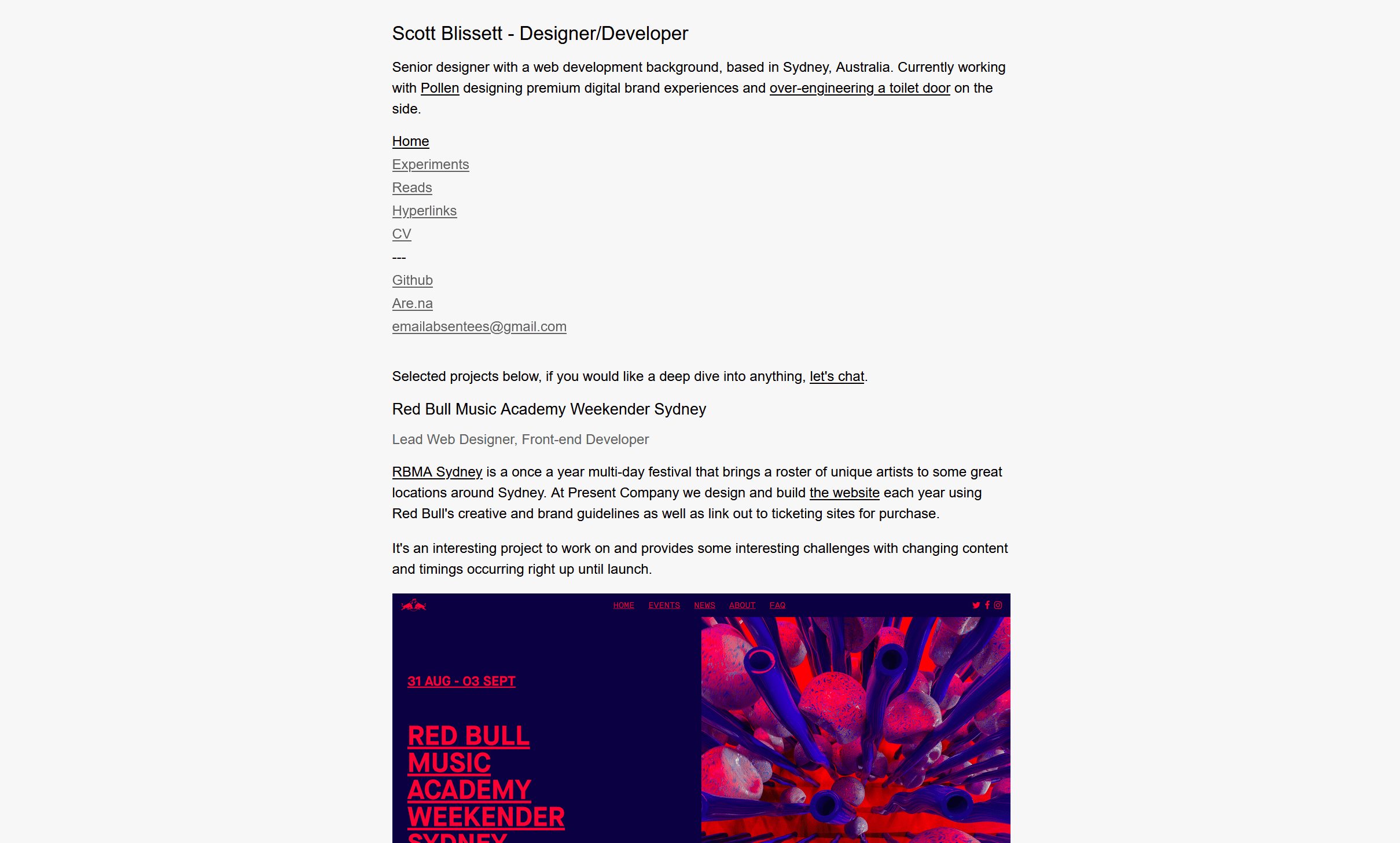 This website, like many other designer's/developer's website, is a test bed for ideas and experimentation. It has been plaintext, HTML and CSS only, Wordpress, DatoCMS backend, Airtable backend, Middleman built in the past which have all had their pros and cons.